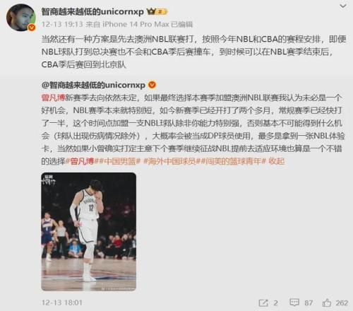 既没有续约北京队,也没签约其他联赛,意味着特别荒唐曾凡博竟然正处于无球可打的状态......有媒体人建议这位年仅22岁的中国前锋可以先加盟澳洲联赛NBL历练,之后再看情况决定是否回归北京队,到时还能赶上CBA季后赛。