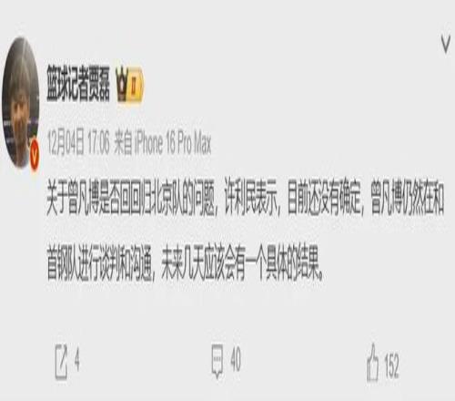 据之前北京队主帅许利民透露,曾凡博还在和球队管理层进行谈判沟通,这哥们今夏新秀合同到期,所以双方现在是就续约问题出现了分歧。