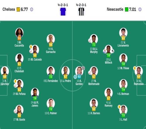 切尔西首发:1-罗伯特·桑切斯、27-古斯托(46' 9-德拉普)、29-韦斯利·福法纳(82' 21-哈托)、23-查洛巴、3-库库雷利亚、24-里斯·詹姆斯、25-凯塞多(61' 45-拉维亚)、10-帕尔默、8-恩佐、49-加纳乔、20-若昂·佩德罗