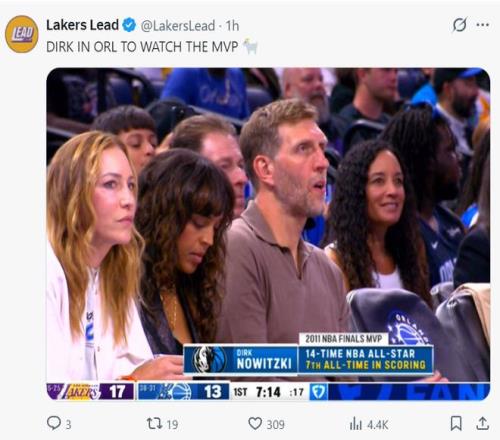 这场比赛德国天王诺维茨基到场观看,湖人媒体调侃:德克来看MVP打球了。